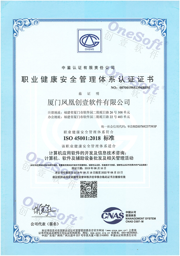 職業(yè)健康安全管理體系認證證書-ISO45001