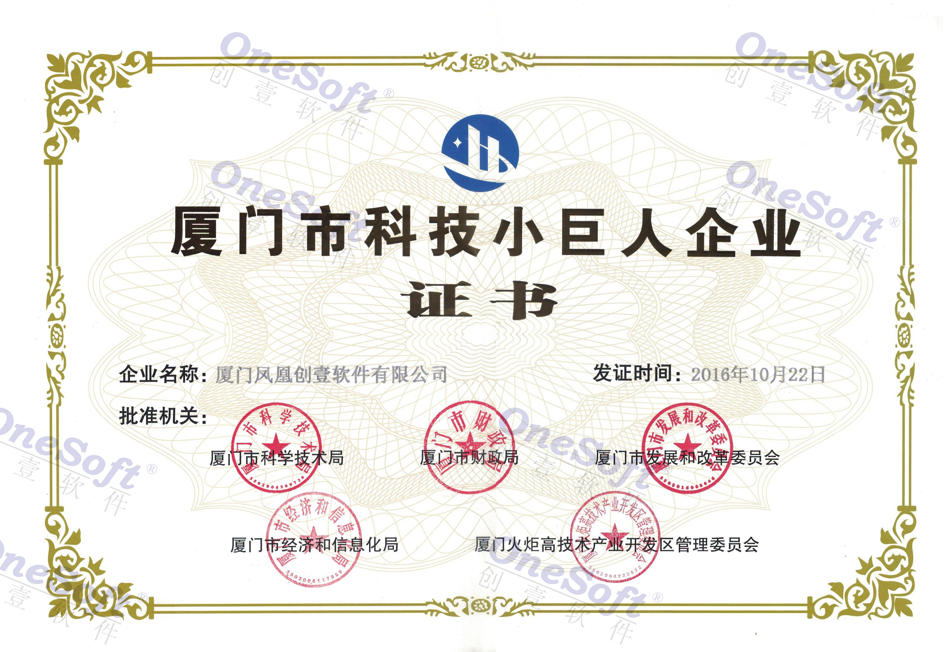 廈門市科技小巨人企業(yè)證書
