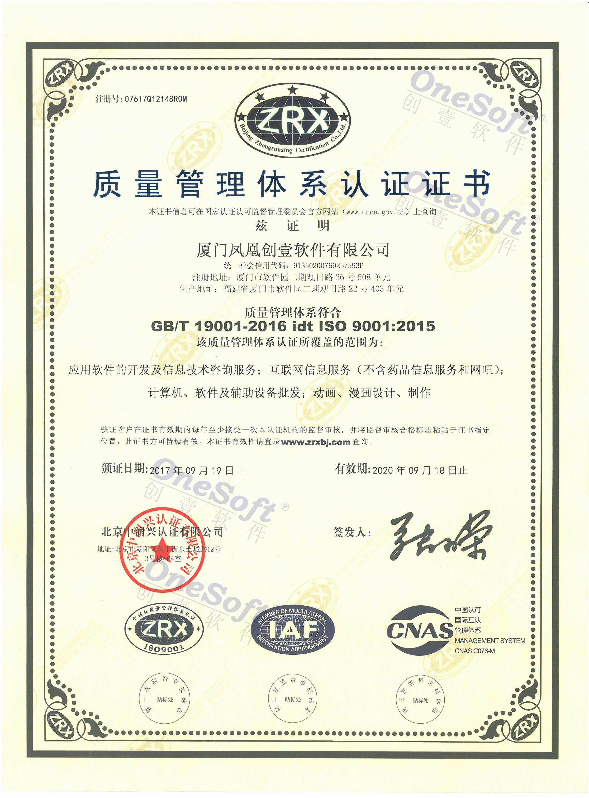 2017年質(zhì)量管理體系認證證書