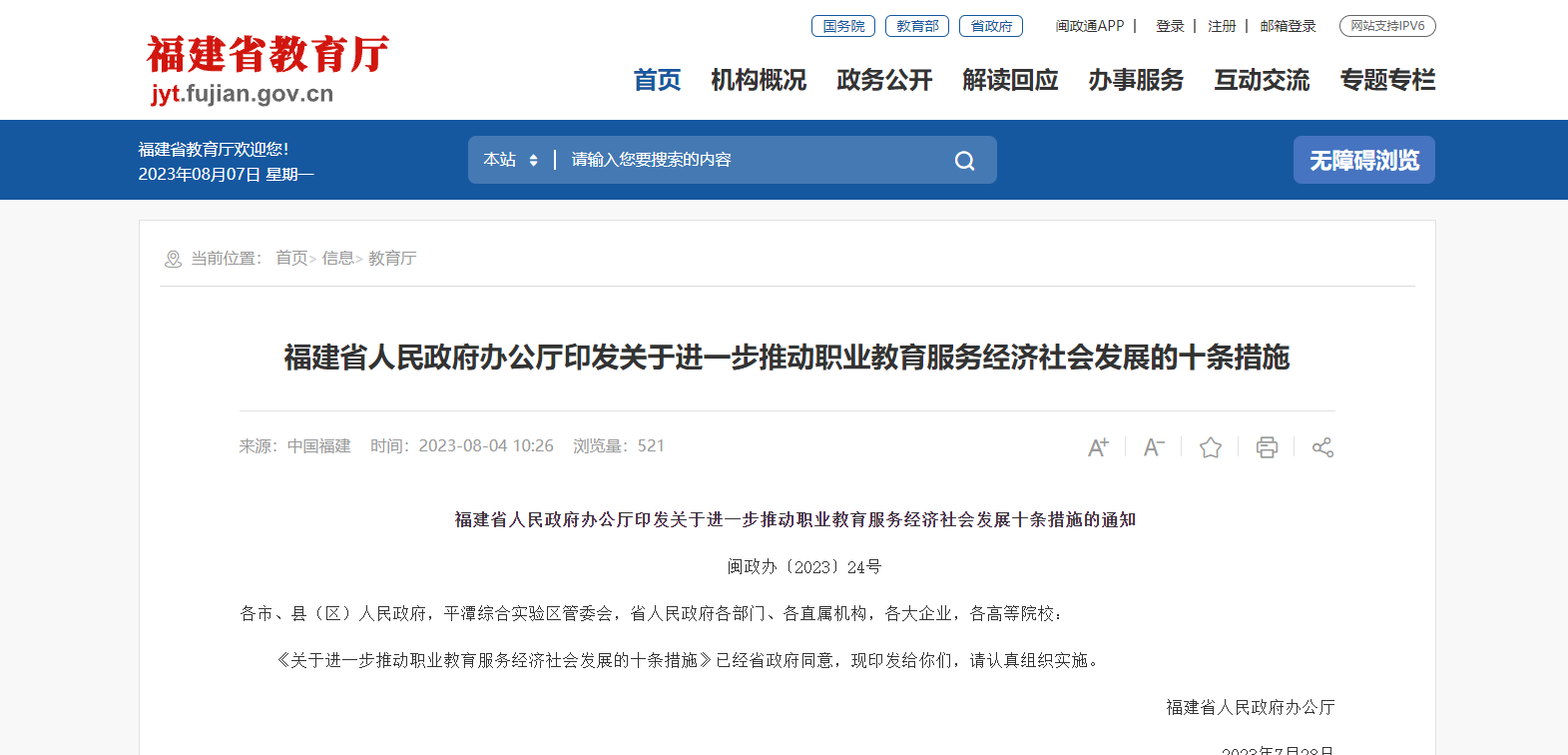 為深入學(xué)習(xí)貫徹黨的二十大精神和習(xí)近平總書記關(guān)于職業(yè)教育的重要指示精神,深入落實全國職業(yè)教育大會部署,根據(jù)中共中央辦公廳、國務(wù)院辦公廳印發(fā)《關(guān)于深化現(xiàn)代職業(yè)教育體系建設(shè)改革的意見》,按照聚焦全省高質(zhì)量發(fā)展現(xiàn)實需求,深化產(chǎn)教融合、校企合作,促進(jìn)教育鏈、人才鏈與產(chǎn)業(yè)鏈、創(chuàng)新鏈銜接的要求,結(jié)合我省經(jīng)濟(jì)社會發(fā)展對職業(yè)教育高質(zhì)量人才培養(yǎng)的迫切期盼,深入推進(jìn)福建特色現(xiàn)代職業(yè)教育體系建設(shè),提出以下十條措施。