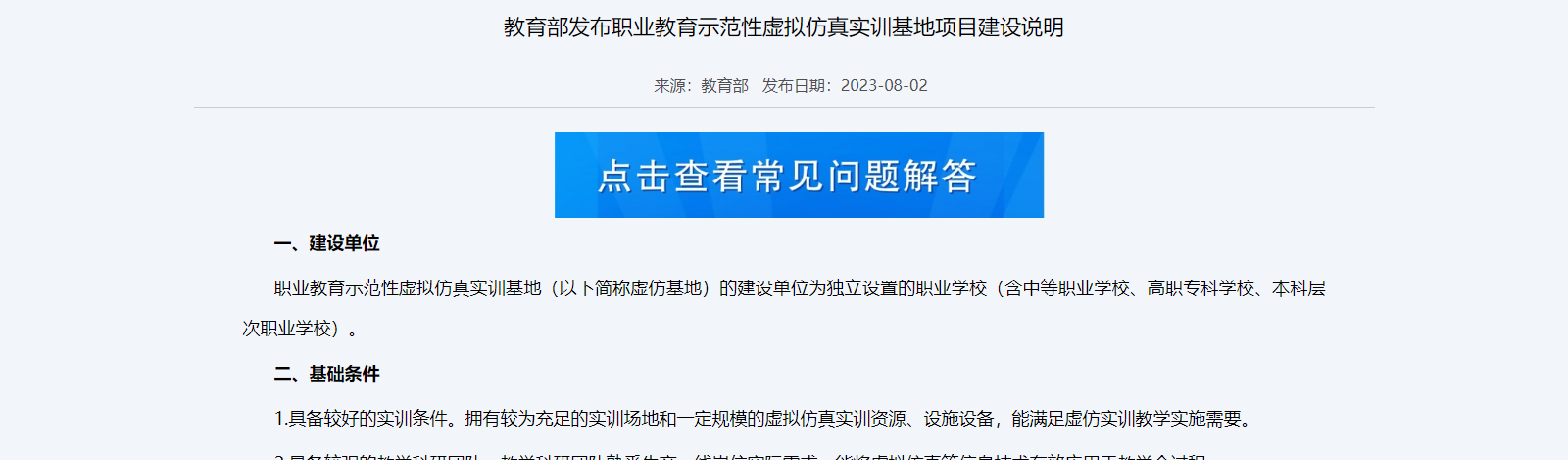 職業(yè)教育示范性虛擬仿真實(shí)訓(xùn)基地(以下簡(jiǎn)稱虛仿基地)的建設(shè)單位為獨(dú)立設(shè)置的職業(yè)學(xué)校(含中等職業(yè)學(xué)校、高職??茖W(xué)校、本科層次職業(yè)學(xué)校)。