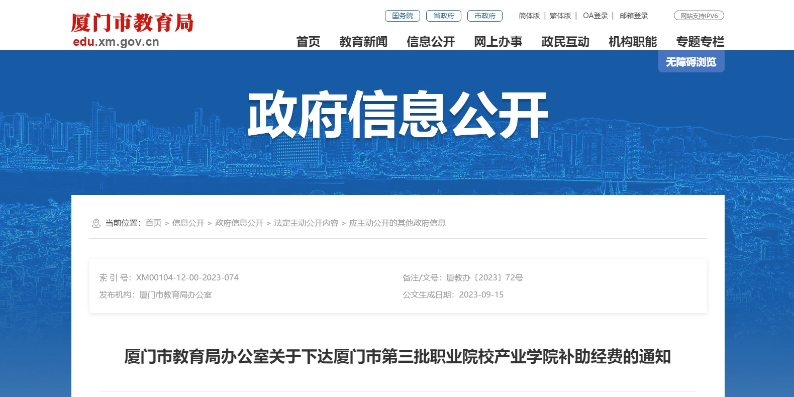 本次下達(dá)的廈門市第三批職業(yè)院校產(chǎn)業(yè)學(xué)院補(bǔ)助經(jīng)費(fèi),應(yīng)用于產(chǎn)業(yè)學(xué)院項(xiàng)目建設(shè)和日常運(yùn)營(yíng),包括專業(yè)建設(shè)及課程建設(shè)、實(shí)驗(yàn)室及實(shí)習(xí)實(shí)訓(xùn)基地建設(shè)、教師能力提升、校企聯(lián)合開展科研課題等項(xiàng)目。