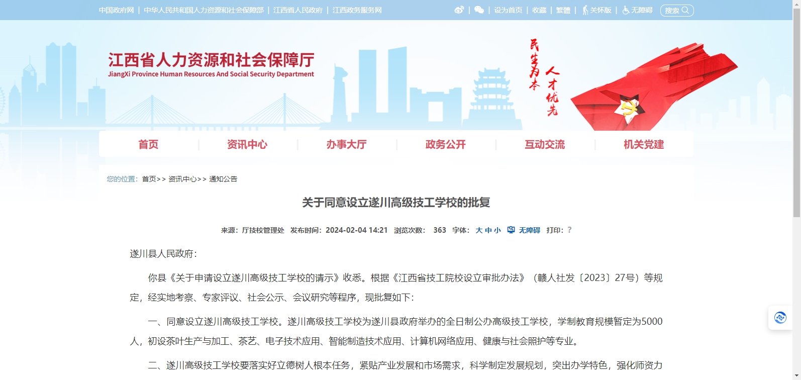 你縣《關(guān)于申請?jiān)O(shè)立遂川高級技工學(xué)校的請示》收悉。根據(jù)《江西省技工院校設(shè)立審批辦法》(贛人社發(fā)〔2023〕27號)等規(guī)定,經(jīng)實(shí)地考察、專家評議、社會公示、會議研究等程序,現(xiàn)批復(fù)如下: