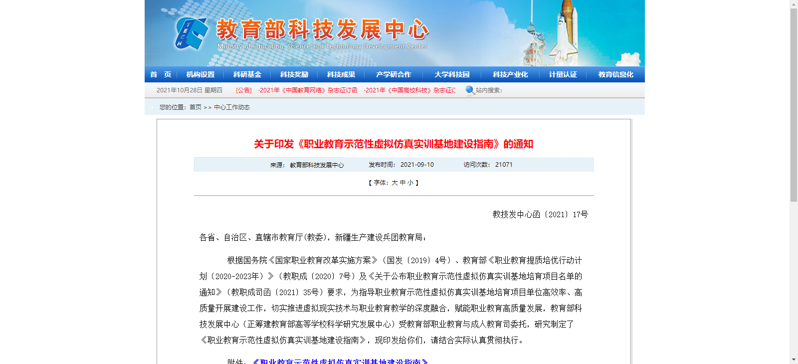 教育部科技發(fā)展中心發(fā)布《職業(yè)教育示范性虛擬仿真實訓基地建設指南》