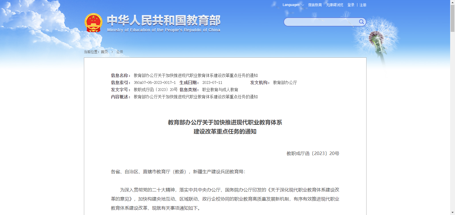 教育部辦公廳關(guān)于加快推進(jìn)現(xiàn)代職業(yè)教育體系 建設(shè)改革重點(diǎn)任務(wù)的通知
