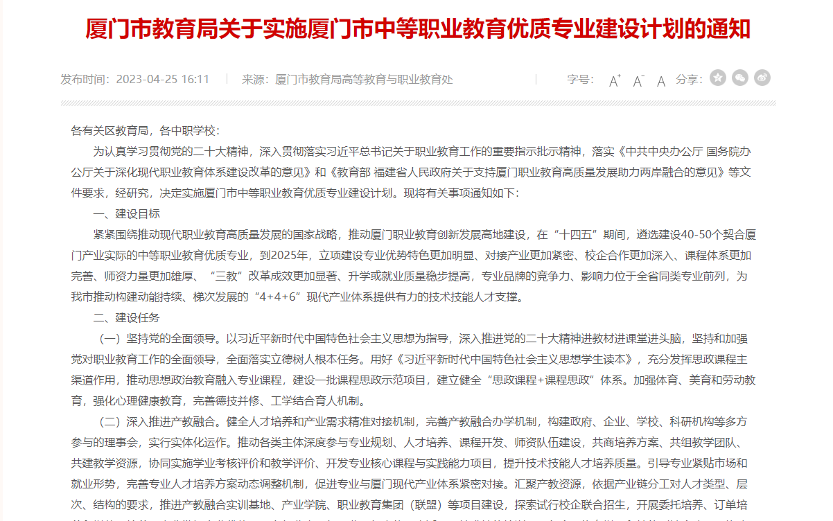 廈門市教育局發(fā)布關(guān)于實(shí)施廈門市中等職業(yè)教育優(yōu)質(zhì)專業(yè)建設(shè)計(jì)劃的通知