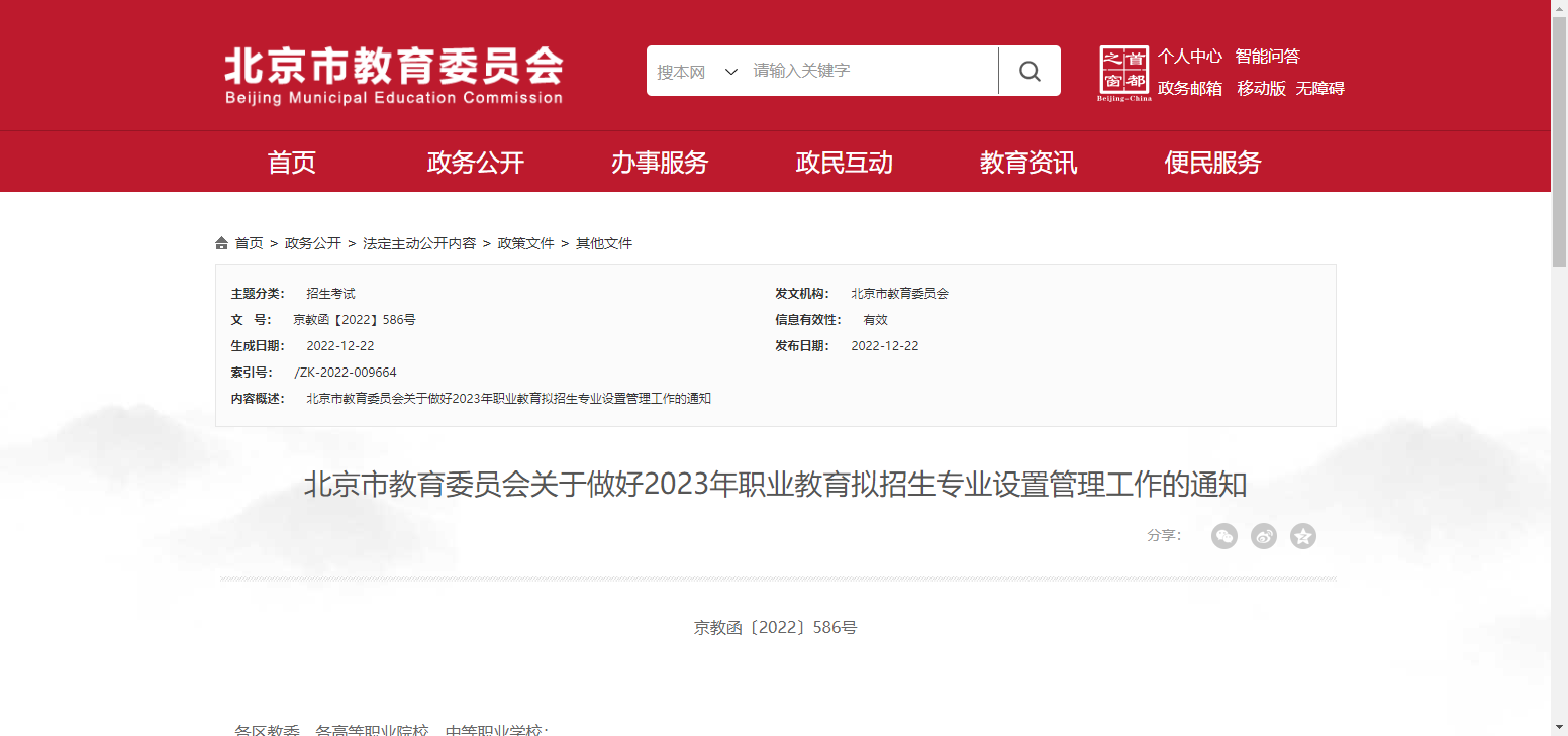 北京市教委發(fā)布《關于做好2023年職業(yè)教育擬招生專業(yè)設置管理工作的通知》