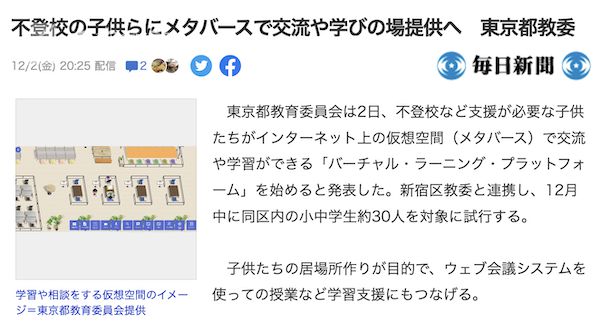 據(jù)《每日新聞》等日媒報道,東京都教育委員會12月2日宣布,為了幫助厭學兒童,將通過元宇宙平臺幫助他們進行日常學習和交流。東京都教委將和新宿區(qū)教委合作,在12月以新宿區(qū)大約30名中小學生為對象先進行試運......