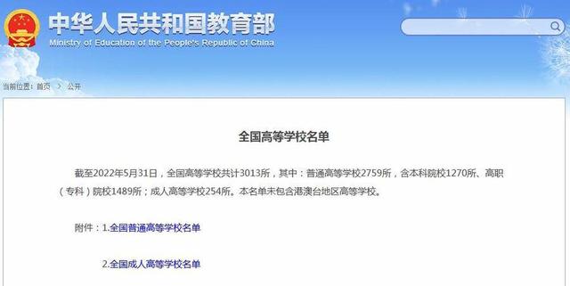 截至2022年5月31日,全國高等學校共計3013所,其中:普通高等學校2759所,含本科院校1270所、高職(??疲┰盒?489所;成人高等學校254所。本名單未包含港澳臺地區(qū)高等學校